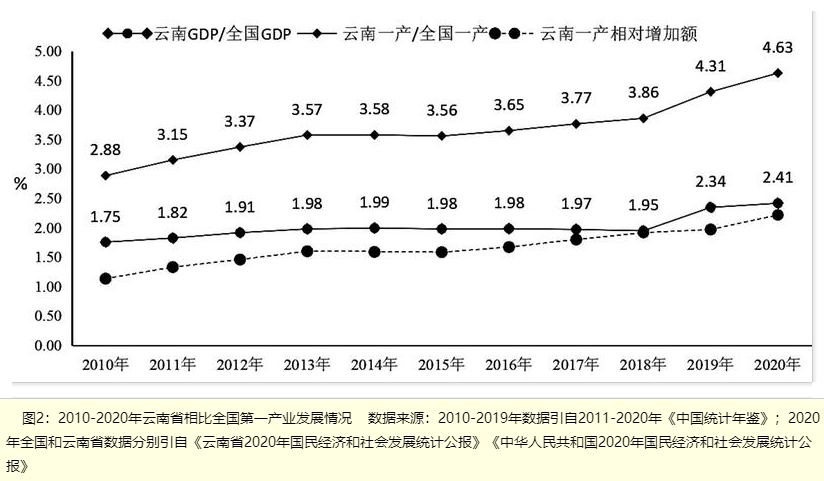 盡管云南第一產(chǎn)業(yè)增加值比重有所下降,但始終高于全國(guó)第一產(chǎn)業(yè)比重,第一產(chǎn)業(yè)在云南三次產(chǎn)業(yè)結(jié)構(gòu)中的地位要高于全國(guó),對(duì)于云南經(jīng)濟(jì)社會(huì)發(fā)展具有更加重要的地位,云南第一產(chǎn)業(yè)在全國(guó)的優(yōu)勢(shì)不斷提升。2012-2020年,云南第一產(chǎn)業(yè)增加值占全省生產(chǎn)總值中的比重從16.05%下降到13.08%,2020年略有上升為14.68%,2021年上半年下降到9%;但是,與全國(guó)相比,2020年和2021年上半年云南省第一產(chǎn)業(yè)增加值比重分別比全國(guó)高出7.02個(gè)百分點(diǎn)、3.66個(gè)百分點(diǎn)。同時(shí),云南省GDP占全國(guó)GDP的比重從2012年的1.91%提高到了2020年的2.41%、提高了0.5個(gè)百分點(diǎn),而第一產(chǎn)業(yè)增加值占全國(guó)第一產(chǎn)業(yè)增加值比重卻從2012年的3.37%提高到了2020年的4.63%、提高了1.26個(gè)百分點(diǎn),詳見圖2,由全國(guó)第14位提升到第9位,首次進(jìn)入全國(guó)前十。
