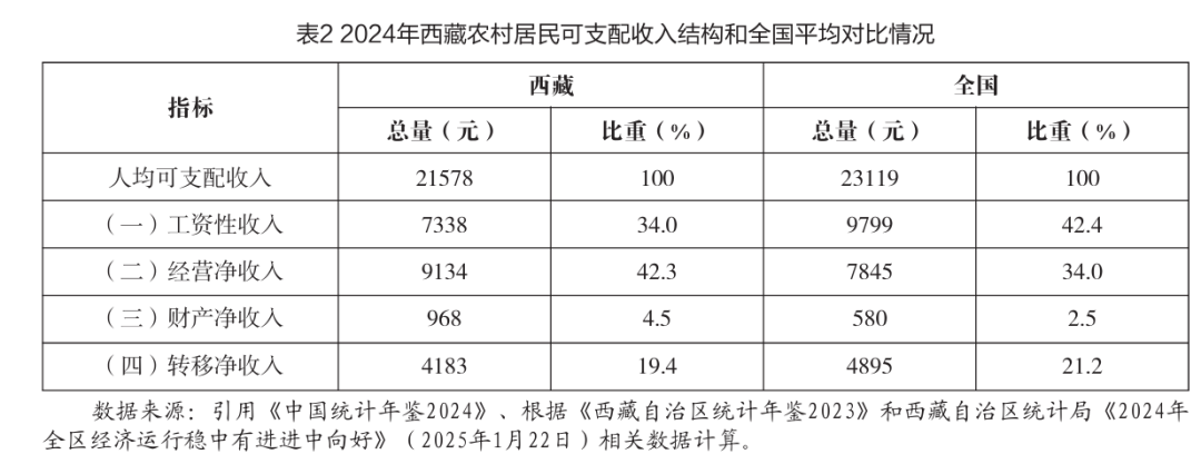 從2024年西藏農(nóng)村居民四項(xiàng)收入來(lái)看,工資性收入和轉(zhuǎn)移凈收入增速略微放緩,隨著西藏經(jīng)濟(jì)市場(chǎng)的復(fù)蘇和市場(chǎng)營(yíng)運(yùn)環(huán)境的改善,一系列刺激實(shí)體經(jīng)濟(jì)政策的出臺(tái)和實(shí)施,經(jīng)營(yíng)凈收入出現(xiàn)明顯增長(zhǎng),收入結(jié)構(gòu)有了一定的優(yōu)化。雖然西藏各級(jí)政府大力落實(shí)各項(xiàng)強(qiáng)農(nóng)惠農(nóng)政策,西藏居民可支配收入的城鄉(xiāng)差距在持續(xù)縮小,但是收入倍差的絕對(duì)值仍然較大。農(nóng)村居民工資性收入低于全國(guó)平均水平,絕對(duì)值和比重均偏低;財(cái)產(chǎn)凈收入占農(nóng)村居民人均可支配收入比重偏低,收入結(jié)構(gòu)不均衡性仍然存在(見(jiàn)表2)。究其根源,由于公共服務(wù)均等化水平還不高、受教育程度低等多重因素,造成農(nóng)牧民就業(yè)大多為第三產(chǎn)業(yè),高知工作就業(yè)率低,低收入者占農(nóng)牧民就業(yè)人數(shù)較多,城鄉(xiāng)發(fā)展存在一定差距。