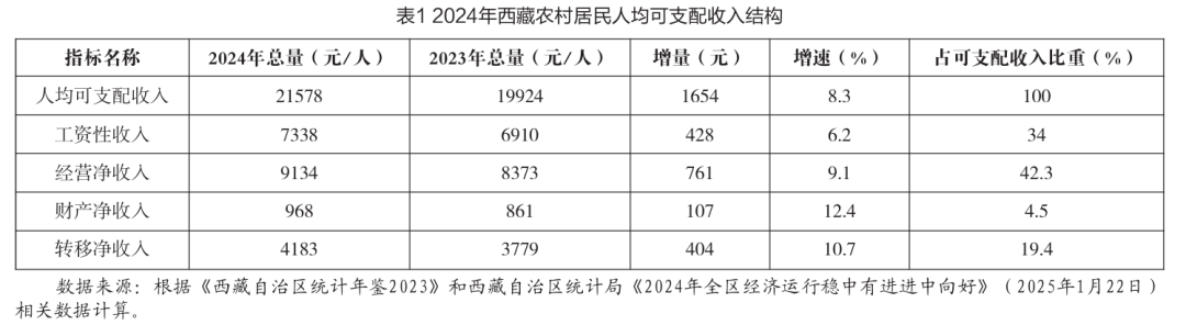 2024年西藏農(nóng)村居民四項(xiàng)收入穩(wěn)中有進(jìn),收入結(jié)構(gòu)不斷優(yōu)化(見(jiàn)表1)。與2023年相比,農(nóng)村居民工資性收入平穩(wěn)增長(zhǎng),增速為6.2%,穩(wěn)固了收入增長(zhǎng)的“基本盤(pán)”。2023年轉(zhuǎn)移凈收入增長(zhǎng)最快,為3779元,增速為14%;與2023年不同的是,2024年經(jīng)營(yíng)凈收入增長(zhǎng)最快,增速為9.1%。在轉(zhuǎn)移凈收入方面,通過(guò)持續(xù)提高各項(xiàng)兜底保障政策標(biāo)準(zhǔn)、及時(shí)兌現(xiàn)各類(lèi)惠民補(bǔ)貼,農(nóng)村居民轉(zhuǎn)移凈收入增長(zhǎng)10.7%。[5]