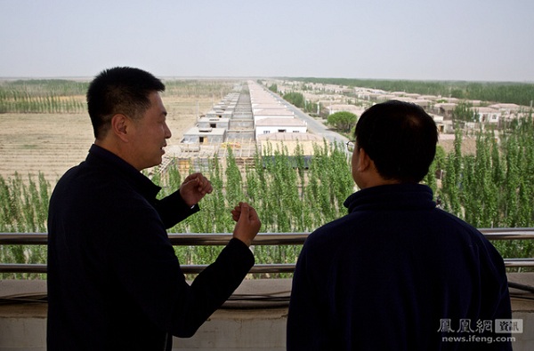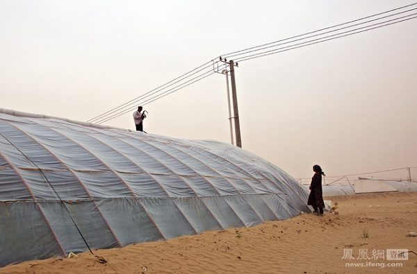 兩名新村村民抱著孩子走過(guò)沙漠上的蔬菜大棚。今年這個(gè)新村還將建成一座幼兒園,完善進(jìn)村公路及村內(nèi)的道路硬化、美化等。