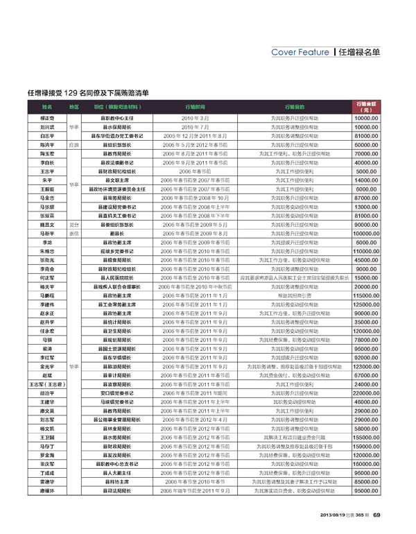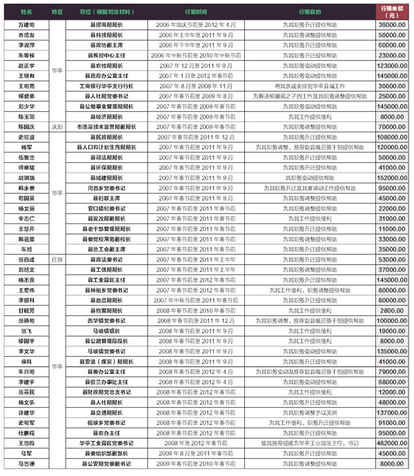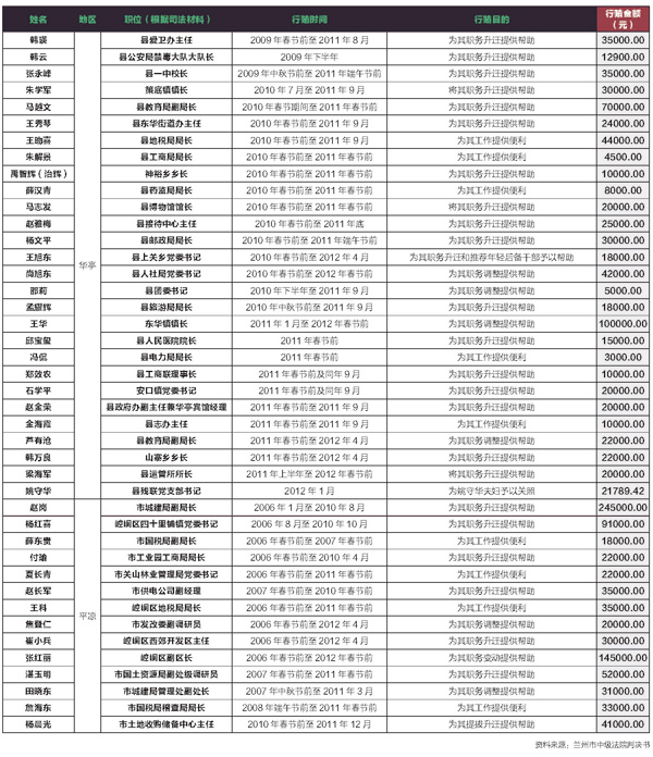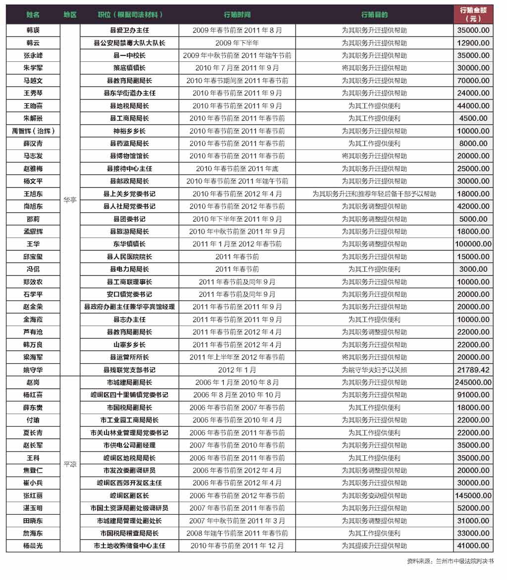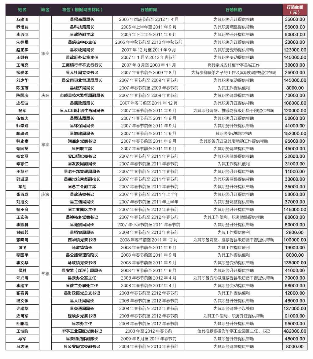 以縣政府細分,賄賂人員涉及的部門有:政府辦公室、發(fā)改局、工信局、教育局、民族宗教局、公安局、民政局、司法局、財政局、人社局、國土局、住建局、交通局、水務(wù)局、農(nóng)牧局、林業(yè)局、旅游局、衛(wèi)生局、人口局、審計局、環(huán)保局、安監(jiān)局、統(tǒng)計局、食品藥監(jiān)局、規(guī)劃局、公用事業(yè)管理局、縣志辦、地震局、愛衛(wèi)辦——如此細列意在說明,除了供銷聯(lián)社,華亭縣政府下29個分支部門幾乎被這份賄賂名單完整覆蓋。