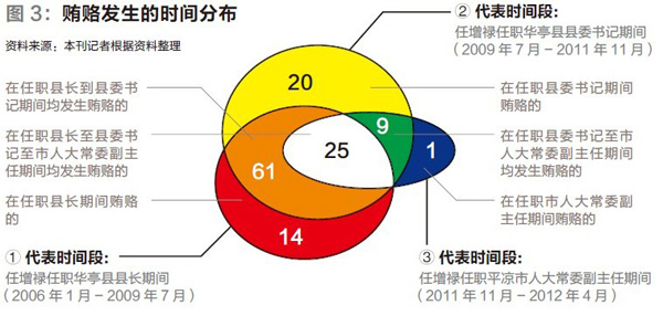 如果以任增祿擔任縣長(代縣長)、縣委書記以及市人大常委副主任為三個時間段,分別劃分成第一、第二、第三區(qū)間可以觀察到:大部分的賄賂橫跨于任增祿擔任縣長與縣委書記期間,自其擔任縣長始,至卸任書記終,只有極少數(shù)的賄賂發(fā)生在其調(diào)任平?jīng)龊蟆?/p>