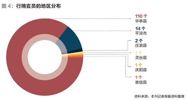 在任增祿案129名涉事的官員中,絕大多數(shù)是華亭本地的官員,占到110名。其余依次為平?jīng)鍪泄賳T14名,莊浪縣官員2名,靈臺、慶陽與崇信縣官員各1名(見圖4)?!敦斀?jīng)》記者通過調(diào)查發(fā)現(xiàn),這19名涉案的華亭縣外干部,皆有在華亭工作的經(jīng)歷,賄賂也發(fā)生在當事人在華亭工作期間。