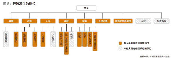 如果對華亭的行政結(jié)構(gòu)進行縱向解剖,第一分支可以分出縣委、縣政府、縣政協(xié)、縣人大、人民團體、鄉(xiāng)鎮(zhèn)、人武部門以及檢法兩院。將此案中的行賄名單對照該行政結(jié)構(gòu)觀察,結(jié)果令人咋舌——在所有的第一分支中,僅人武部門和檢法兩院沒有工作人員在行賄名單上,而縣委、縣政府以及各鄉(xiāng)鎮(zhèn),是發(fā)生賄賂的重點受災(zāi)區(qū)(見圖5)。