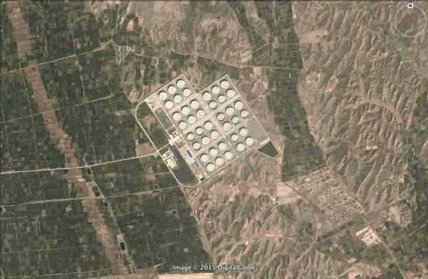 位于蘭州新區(qū)秦川鎮(zhèn)東部的原油儲(chǔ)備庫(kù)衛(wèi)星影像圖,拍攝時(shí)間為2013年7月29日,當(dāng)時(shí)周邊尚無(wú)任何石化設(shè)施建設(shè)。