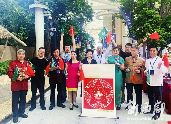 ▲袁紅(左六)和非遺傳承人參加建國七十周年暨澳門回歸二十周年慶典活動(dòng)