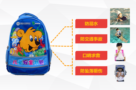 2015年,中國(guó)婦女發(fā)展基金會(huì)發(fā)起了“兒童安全書(shū)包”公益項(xiàng)目作為“守護(hù)童年”大型公益行動(dòng)的又一個(gè)積極舉措。書(shū)包上的反光材料可以有效反射50米內(nèi)過(guò)往車(chē)輛發(fā)出的燈光,減少交通意外的發(fā)生;書(shū)包借鑒浮力板原理,采用抗壓性能強(qiáng)浮力好的填充材料,可在孩子不慎落水時(shí)延長(zhǎng)被救援時(shí)間;安全書(shū)包還配置了戶(hù)外高頻求生口哨,只要一息尚存,就可以吹響口哨,為生命延續(xù)贏得希望……這些功能,可以在孩子出行,比如上學(xué)路上遇到危險(xiǎn)時(shí)提供必要的保護(hù),對(duì)于那些缺少大人陪護(hù),身處貧困地區(qū)的留守兒童來(lái)說(shuō),更顯重要。