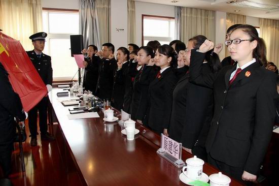 為增強(qiáng)法官的職業(yè)榮譽(yù)感和工作責(zé)任感,勉縣法院決定對(duì)2014年新任命的12名法官舉行法官宣誓儀式。勉縣法院副院長楊小林宣讀初任法官的任命決定,全體干警起立奏中華人民共和國國歌。兩名法警護(hù)衛(wèi)著鮮艷五星紅旗,12名初任年輕法官面向國旗,在政工科長王亮的帶領(lǐng)下,莊嚴(yán)宣誓“我是中華人民共和國法官,我宣誓:忠于祖國,忠于人民,忠于憲法和法律,忠實(shí)履行法官職責(zé),恪守法官職業(yè)道德,遵守法官行為規(guī)范,公正司法,廉潔司法,為民司法,為維護(hù)社會(huì)公平正義而奮斗!”