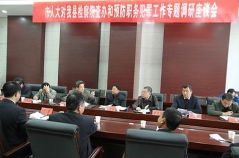 橫山縣檢察院王勇檢察長向調(diào)研組匯報了2010年以來查辦和預(yù)防職務(wù)犯罪工作情況,并分別就反貪污賄賂工作、反瀆職侵權(quán)工作和職務(wù)犯罪預(yù)防工作做了詳細匯報。同時也指出查辦和預(yù)防職務(wù)犯罪工作中存在的困難和問題,他談到近年來查辦和預(yù)防職務(wù)犯罪工作中存在村官職務(wù)犯罪案件定性難、辦案信息查詢難、技偵裝備利用率低、查辦案件干擾多、阻力大、對證人取證難等諸多問題。也對加強查辦和預(yù)防職務(wù)犯罪工作提出了建立健全全面的執(zhí)法辦案協(xié)調(diào)配合、信息共享機制、職業(yè)化檢察官選配、考評機制等建議和意見。