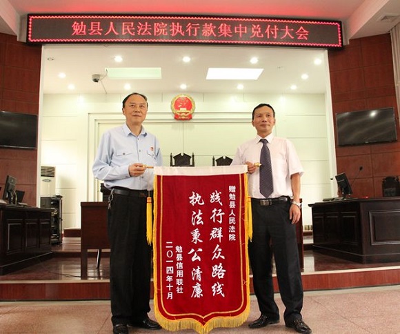 一份耕耘,一份收獲。在勉縣法院執(zhí)行干警的不懈努力下,一批群眾關(guān)切的執(zhí)行難案、大案取得了突破,為當(dāng)事人追回了損失,維護(hù)了法律的尊嚴(yán),得到了群眾的認(rèn)可。在執(zhí)行款集中兌付大會,申請人代表勉縣信用聯(lián)社將一面寫有“踐行群眾路線,執(zhí)法秉公清廉”的錦旗送給法官,體現(xiàn)了人民群眾的心聲。