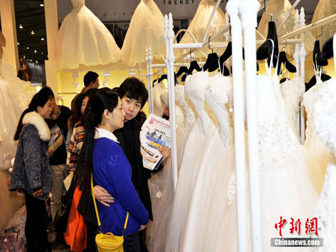 2月22日,第九屆成都(春季)婚慶博覽會在四川開幕,作為西南最大規(guī)模的婚博會,首日吸引超過約2萬對新人前來參觀。在婚博會現(xiàn)場很多標(biāo)有婚紗攝影和“私人定制”婚禮的展位吸引大量新人前來咨詢,“私人定制”婚禮形式已成為結(jié)婚新潮流。圖為婚博會上選購婚紗的情侶。安源 攝