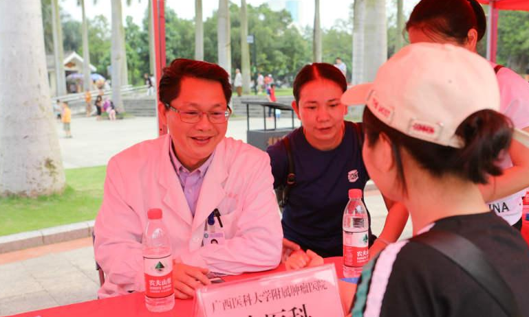 當(dāng)天,廣西抗癌協(xié)會各專業(yè)委員會、腫瘤醫(yī)院各黨支部和各學(xué)科的專家們在南湖公園“三月三”歡歌廣場開展義診活動。自治區(qū)疾控中心及南寧市疾控中心的專家們也來到現(xiàn)場,為群眾開展慢性病防治知識宣傳咨詢和宮頸癌疫苗宣傳咨詢。
