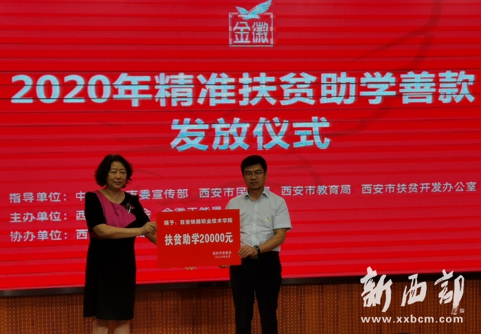 ▲西安市慈善會(huì)副會(huì)長(zhǎng)衛(wèi)冬梅向西安鐵路職業(yè)技術(shù)學(xué)院院長(zhǎng)趙春平(右)轉(zhuǎn)交2萬(wàn)元善款示意牌