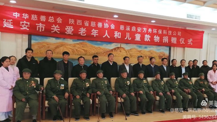 2020年12月14日,中華慈善總會、陜西省慈善協(xié)會、慈溪鼎安方舟環(huán)??萍脊鞠蜓影簿栀涥P(guān)愛老人和兒童款物儀式在延安八一敬老院舉行。全國人大社會建設(shè)委員會副主任委員、中華慈善總會會長宮蒲光,陜西省委常委、延安市委書記徐新榮,省人大原副主任、省慈善協(xié)會會長吳前進出席并講話,中華慈善總會秘書長邊志偉、宣傳部部長曾春光 ,延安市委常委、副市長高昕昱,省慈善協(xié)會副會長張文亮,延安市慈善協(xié)會會長郝飚,延安市委秘書長張世保,延安市民政局局長何樹德、市退役軍人事務(wù)局局長牛永紅,慈溪鼎安方舟環(huán)保科技有限公司董事長汪慶福、總經(jīng)理李先強等參加捐贈活動,省慈善協(xié)會常務(wù)副會長李榮杰主持儀式。