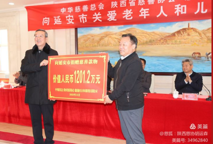 捐贈儀式上,共向延安捐贈款物1201萬元,包括:電視機、冷熱凈水器、空氣凈化器、彩超AI平臺系統(tǒng)、圖書、消毒液、口罩、棉馬甲,米面油及關(guān)愛老人、兒童、知青、困難群眾雙節(jié)送溫暖慰問金。其中向延安八一敬老院捐贈35萬元的款物。中華慈善總會秘書長邊志偉向延安市慈善協(xié)會會長郝飚遞交了捐贈展示牌,省慈善協(xié)會副會長張文亮向延安八一敬老院院長薛莉遞交了捐贈展示牌。在延安的此次捐贈活動,同時拉開了全省2021年元旦、春節(jié)送溫暖活動的帷幕。