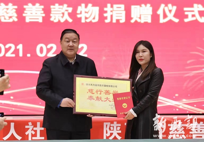 ▲吳前進(jìn)會(huì)長(zhǎng)向四川天力嘉華醫(yī)療器械有限公司總經(jīng)理劉奕含頒發(fā)捐贈(zèng)證書(shū)和榮譽(yù)牌匾。