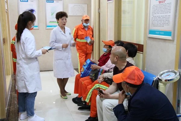 醫(yī)生為排隊的環(huán)衛(wèi)工人簡單介紹體檢項目