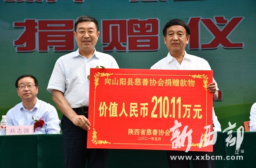▲陜西省慈善協(xié)會副會長蘇新泉向山陽縣慈善協(xié)會會長張達喜(右)遞交捐贈展示牌