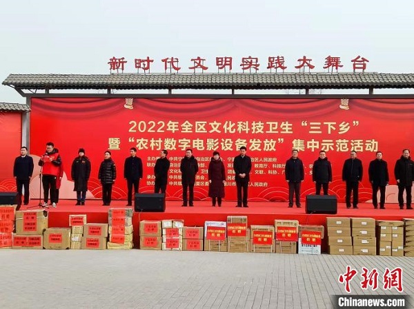中新網銀川1月26日電 (李佩珊 楊萱)眼下正是寒冬臘月,卻抵擋不住民眾參加新春活動的熱情。1月26日,寧夏2022年文化科技衛(wèi)生“三下鄉(xiāng)”暨“農村數字電影設備發(fā)放”集中示范活動在銀川市西夏區(qū)懷遠路街道富寧村新時代文明實踐廣場舉行。寧夏黨委宣傳部、農業(yè)農村廳、衛(wèi)健委等相關部門為西夏區(qū)民眾帶來文化、科技、衛(wèi)生、教育、鄉(xiāng)村振興等方面的項目,捐贈圖書、學生學習用品、“學習強國”學習平臺電視端等物資及農村數字電影公益放映設備。