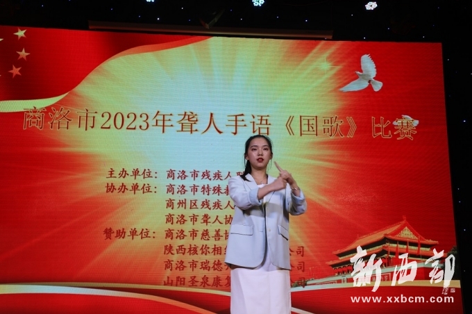 比賽中,參賽選手們伴隨著《國(guó)歌》鏗鏘有力的旋律,口手并用、聲情并茂,用莊嚴(yán)、激昂的手語(yǔ)展示了殘疾人自尊、自信、自立、自強(qiáng)的生活信念以及自己對(duì)祖國(guó)的熱愛(ài)之情。