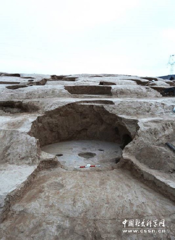 廟梁遺址位于榆林市靖邊縣楊橋畔鎮(zhèn)楊二村東南,處在蘆河上游東支西岸的黃土臺(tái)地之上。2017年9月至12月,陜西省考古研究院聯(lián)合榆林市文物考古勘探隊(duì)、靖邊縣文管辦對(duì)遺址進(jìn)行了考古工作。邵晶介紹,本次發(fā)掘的重要遺跡包括房址27座、灰坑47座、窯址2座以及墓葬1座。房址集中分布于梁峁西側(cè)的坡地上,沿山坡等高線弧形排列。均為掏挖于黃土中的地穴式建筑,主體建筑應(yīng)為窯洞。根據(jù)形狀結(jié)構(gòu)可分為兩類:一為單體窯洞,平面均為圓形,面積在15平方米以上,鋪設(shè)白灰地面,室內(nèi)多掏挖有儲(chǔ)藏窖穴,房前一般設(shè)有稍微下凹的活動(dòng)空間,不甚規(guī)整;二為前后室連接的復(fù)合結(jié)構(gòu),平面呈凸字形,前室為長(zhǎng)方形的半地穴建筑,后室均為平面呈圓角方形的窯洞,面積較第一類窯洞小,一般在10平方米以下。