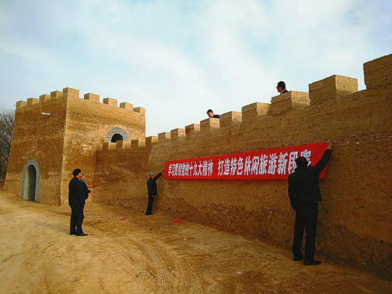 插紅旗的這段城墻,是黃甫鎮(zhèn)政府修建的。按照鎮(zhèn)上的產(chǎn)業(yè)發(fā)展規(guī)劃,段寨村未來(lái)要走兩條路,一條路是產(chǎn)業(yè)調(diào)整后的新農(nóng)業(yè),用市場(chǎng)手段、新技術(shù)手段,使段寨村的產(chǎn)業(yè)實(shí)現(xiàn)規(guī)模經(jīng)營(yíng);另一條路,就是借龍舌灣這個(gè)得天獨(dú)厚的黃河自然風(fēng)貌,發(fā)展鄉(xiāng)村旅游,把段寨村打造成沿黃觀光路上最漂亮的一個(gè)鄉(xiāng)村旅游觀光地。按照鎮(zhèn)上的規(guī)劃,目前矗立在黃河崖頂?shù)某菈?,還要修建得更有規(guī)模,恢復(fù)到百年前段寨村的寨堡模樣。