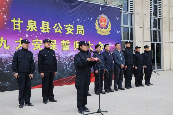 大會上,縣公安局陳衛(wèi)星局長帶領全體公安民警宣誓了《人民警察誓詞》?!拔抑驹赋蔀橹腥A人民共和國人民警察……”,鏗鏘有力、擲地有聲的誓言充分展現(xiàn)了甘泉公安民警打贏十九大安保維穩(wěn)攻堅戰(zhàn)的信心和決心。號角錚錚、警徽熠熠,隨后的匯報演練贏得了陣陣喝彩。