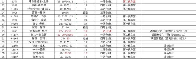 暑運(yùn)期間加開(kāi)4趟,楊凌—神木的K8190到發(fā)時(shí)刻7:20/8:00,神木—西安的K8189到發(fā)時(shí)刻14:30/42,寶雞-神木的K8198 到發(fā)時(shí)刻18:20/32,神木-寶雞K8197到發(fā)時(shí)刻23:23/35。