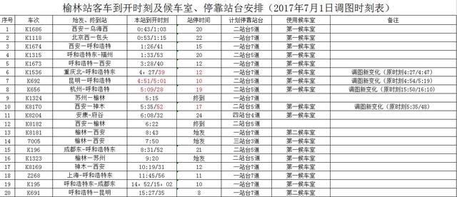 新西部網(wǎng)榆林訊(通訊員邱峰)2017年7月1日零時(shí)起,榆林車站共有7個(gè)車次的時(shí)刻發(fā)生變化,分別是重慶北—呼和浩特東的K1536由原時(shí)刻4:27/4:47調(diào)整為4:27/39, 昆明—呼和浩特K692由原時(shí)刻4:54/5:19調(diào)整為4:51/5:01,杭州-呼和浩特的K656由原時(shí)刻15:50/16:10調(diào)整為5:09/28,西安—神木的K8170由原時(shí)刻5:35/48調(diào)整為5:35/52,呼和浩特-杭州的K655 由原時(shí)刻15:50/16:10調(diào)整為22:40/50,包頭—北京西的K1117 由原時(shí)刻22:47/59調(diào)整為22:58/23:08,榆林—寶雞的K8165始發(fā)原時(shí)刻23:18始發(fā)調(diào)整為23:20。
