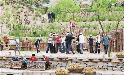 耕種、打夯、娶親、祈雨……在起伏的溝峁間種瓜點(diǎn)豆、繁衍生息、祈雨求神、收獲喜悅,栩栩如生地演繹著祖祖輩輩生生不息的生產(chǎn)生活情景。這就是《高高山上一頭?!繁憩F(xiàn)給游客的充滿鄉(xiāng)土味的藝術(shù)場(chǎng)景。