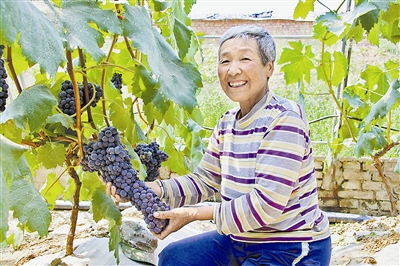 來到趙家峁村,沿著水果采摘的指示牌行走,展現(xiàn)在眼前的是30多個現(xiàn)代化溫棚。棚內(nèi)的葡萄已近成熟,串串飽滿,顆顆晶瑩。村民李三娃頭戴遮陽帽,手拿小剪刀,認(rèn)真細(xì)致地修剪著多余的葡萄枝葉。“我們村上為幫助大家伙兒脫貧,修建起了大棚。我從2014年10月開始在這里打工,專門負(fù)責(zé)修剪、施肥、鋤草,每個月能收入2400塊錢。”