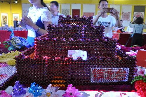 現(xiàn)場(chǎng),榆林各個(gè)縣區(qū)的手工藝優(yōu)秀作品陳列于展廳,剪紙、面捏、泥塑、石雕、刺繡等等,不斷獲得稱贊。其中一個(gè)串珠作品《鎮(zhèn)北臺(tái)》引起了來(lái)自高凌參觀者的關(guān)注。據(jù)作者王愛萍介紹,這個(gè)《鎮(zhèn)北臺(tái)》由3萬(wàn)顆串珠手工編制而成,重達(dá)20多斤,花費(fèi)了整整一個(gè)月。她稱若是時(shí)間足夠的話,會(huì)把榆林的“六樓”都做出來(lái)。