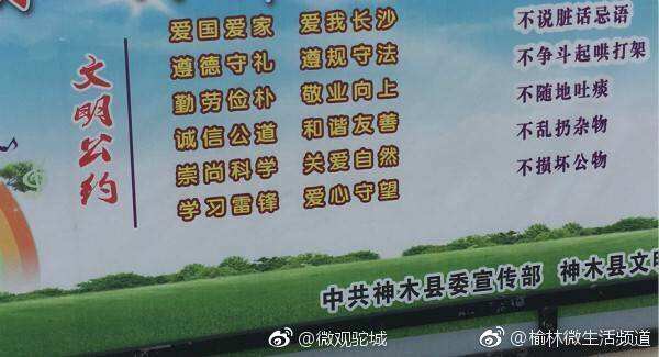 在網(wǎng)友發(fā)布的照片中,記者看到出錯的是一則“文明公約”,其中第一句話是“愛國愛家愛我長沙”,在這句話外還有“遵德守禮、遵規(guī)守法、勤勞儉樸、敬業(yè)向上”等字樣。而這個文明標(biāo)語的落款則是“中共神木縣委宣傳部、神木縣文明辦”,網(wǎng)友稱宣傳標(biāo)語位于神木縣第八幼兒園附近。