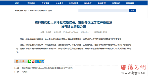 6月20日,記者從榆林市紀(jì)檢監(jiān)察網(wǎng)了解到,經(jīng)中共榆林市委批準(zhǔn),榆林市紀(jì)委對(duì)榆林市勞動(dòng)人事仲裁院原院長(zhǎng)、支部書記徐彥江嚴(yán)重違紀(jì)問(wèn)題進(jìn)行了立案審查。