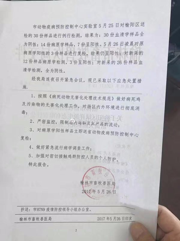 華商報記者在該文件上看到,該公司位于牛家梁鎮(zhèn),存欄雞蛋有4.5萬羽,雞群從5月21日開始發(fā)病并有零星死亡現象,23日開始大量死亡,截止25日上午8時,死亡7000余羽;25日上午8時至當晚9時死亡1500余羽,累計死亡22000余羽。同時,榆林市動物疫病預防控制中心實驗室對送檢的樣品進行了監(jiān)測。