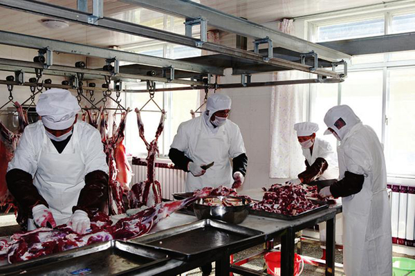 雙城鄉(xiāng)羊產(chǎn)業(yè)合作社——加工分割車間,年生產(chǎn)能力達(dá)500噸。目前有這樣的大型肉類聯(lián)合加工廠12家,年屠宰能力50萬只。