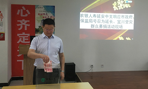 農(nóng)銀人壽延安中支積極響應(yīng)市政府呼吁、保監(jiān)局分局的倡議為延長、宜川受災(zāi)群眾募捐,7月27日上午在總經(jīng)理室在張琳200元、楊芳兒200元捐款的帶動下,全體公司內(nèi)勤進(jìn)行一次愛心捐款活動,發(fā)揚“一方有難,八方援助”的中華傳統(tǒng)美德,獻(xiàn)出愛心。