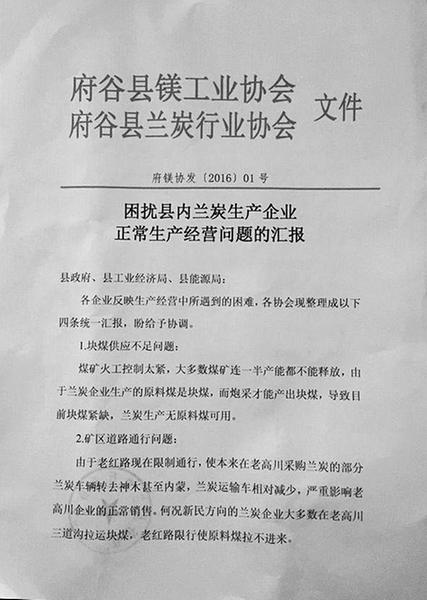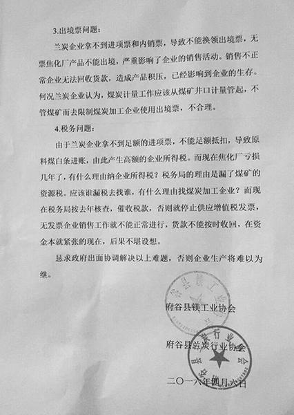2016年4月6日一份由陜西府谷縣蘭炭行業(yè)和鎂工業(yè)協(xié)會(huì)起草的(府鎂協(xié)發(fā)第2016零一號(hào)文件)就行業(yè)面臨稅費(fèi)現(xiàn)狀向府谷縣各職能部門反映。反映內(nèi)容:1.蘭炭企業(yè)拿不到進(jìn)項(xiàng)票和內(nèi)銷票,導(dǎo)致不能換領(lǐng)出境票,無票焦化廠產(chǎn)品不能出境,嚴(yán)重影響了企業(yè)的銷售活動(dòng)。銷售不正常企業(yè)無法回收貸款,造成產(chǎn)品積壓,已經(jīng)影響到企業(yè)的生存。何況蘭炭企業(yè)認(rèn)為,煤炭計(jì)量工作應(yīng)該從煤礦井口計(jì)量管起,不去管煤礦而是去限制煤炭加工企業(yè)使用出境票,不合理。2.由于蘭炭企業(yè)拿不到足額的進(jìn)項(xiàng)票,不能足額抵扣,導(dǎo)致原料煤白條進(jìn)賬,由此產(chǎn)生高額的企業(yè)所得稅。而現(xiàn)在焦化廠虧損幾年了,有什么理由納企業(yè)所得稅?稅務(wù)局的理由是漏了煤礦的資源稅。應(yīng)該誰漏稅去找誰,有什么理由找煤炭加工企業(yè)?而現(xiàn)在稅務(wù)局按去年核查,催收稅款,否則就停止供應(yīng)增值稅發(fā)票。