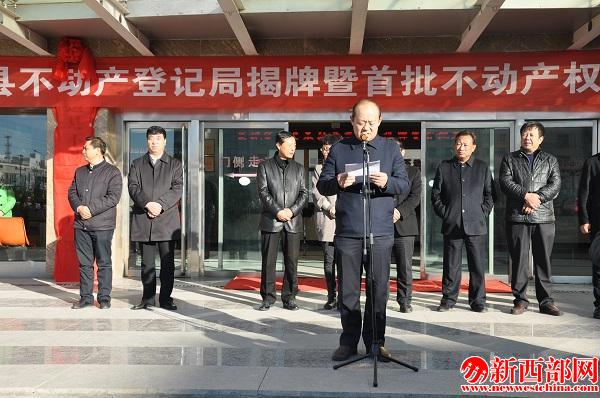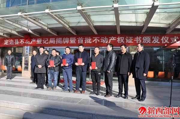 新西部網(wǎng)榆林訊(記者王永程)12月25日上午,定邊縣“全縣不動(dòng)產(chǎn)登記局揭牌暨全縣首批不動(dòng)產(chǎn)權(quán)證書(shū)頒證儀式”在定邊縣國(guó)土資源局一樓舉行。定邊縣編辦主任鄒興平宣讀了榆林市機(jī)構(gòu)編制委員會(huì)辦公室《關(guān)于組建定邊縣不動(dòng)產(chǎn)登記機(jī)構(gòu)的通知》,定邊縣不動(dòng)產(chǎn)登記局局長(zhǎng)任小龍為不動(dòng)產(chǎn)登記局成立致辭, 陜西省不動(dòng)產(chǎn)登記局局長(zhǎng)王文,榆林市國(guó)土資源局局長(zhǎng)姚宏和定邊縣委書(shū)記崔博為不動(dòng)產(chǎn)登記局揭牌,并為首批取得《不動(dòng)產(chǎn)權(quán)證書(shū)》的權(quán)利人頒發(fā)證書(shū)。