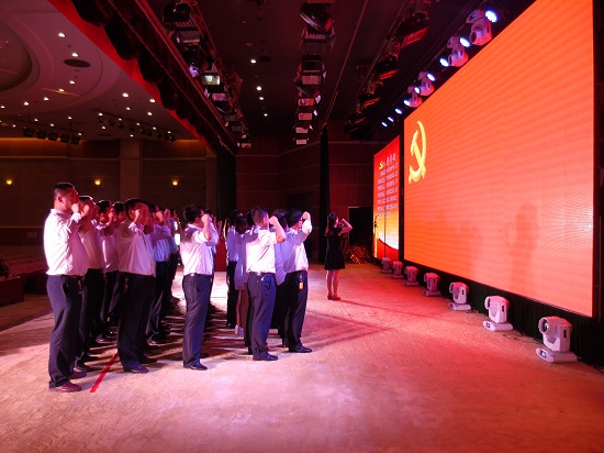 全集團(tuán)50名預(yù)備黨員到臺(tái)前列隊(duì),面向黨旗,舉右手宣誓,集團(tuán)公司黨群工作部副部長(zhǎng)張小荔同志帶領(lǐng)預(yù)備黨員宣讀入黨誓詞。