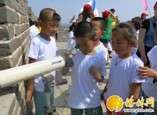 同學(xué)們爭(zhēng)相從高倍望遠(yuǎn)鏡中看明長(zhǎng)城遺址。