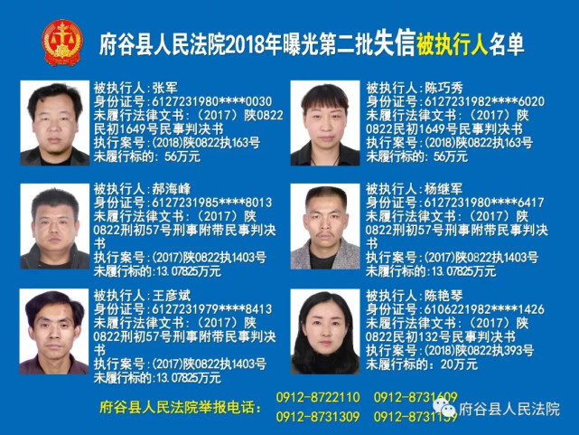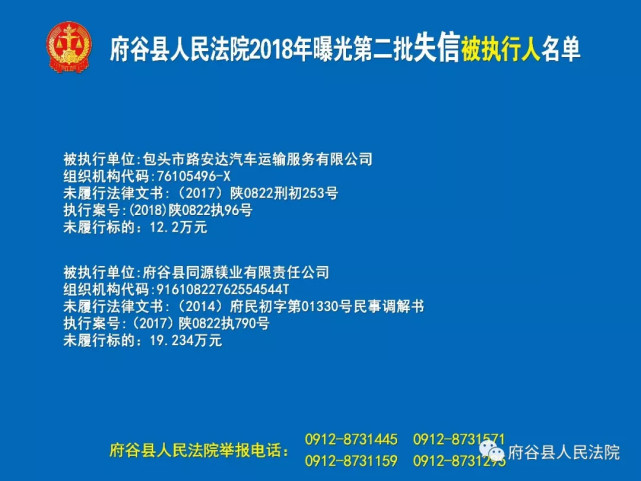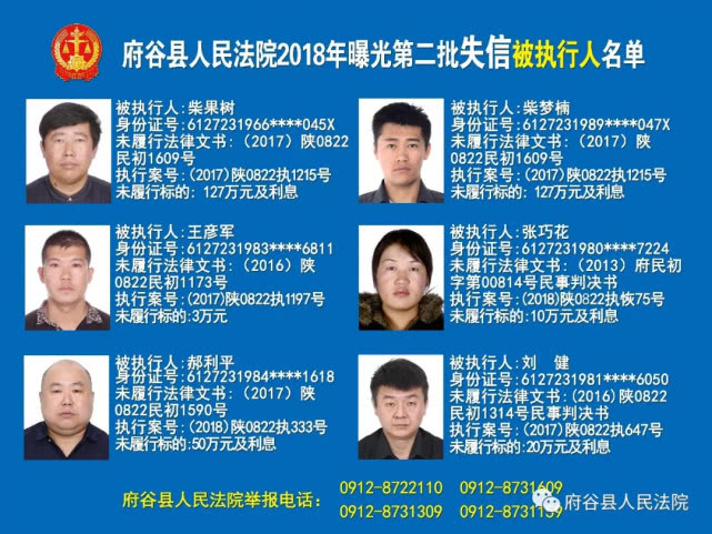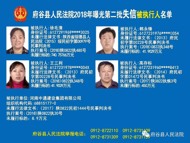 為督促被執(zhí)行人自覺履行生效法律文書所確定的義務(wù),切實(shí)保障債權(quán)人的合法權(quán)益,現(xiàn)將府谷縣人民法院執(zhí)行案件的部分失信被執(zhí)行人名單予以曝光。在此,本院鄭重告誡有履行能力的被執(zhí)行人,放棄僥幸心理,主動(dòng)履行義務(wù)。對(duì)于有償還能力拒不償還,對(duì)抗、逃避執(zhí)行,轉(zhuǎn)移、隱匿財(cái)產(chǎn)的被執(zhí)行人,本院將采取嚴(yán)厲的執(zhí)行和制裁措施。