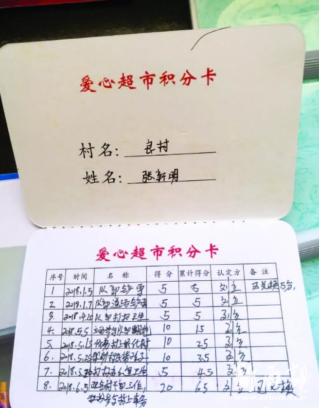 良村村委會(huì)主任孔根虎介紹說,鉗二社區(qū)便民服務(wù)中心統(tǒng)一設(shè)計(jì)制作的愛心超市積分卡類似于存折,群眾可以自己保存,也可以存放到愛心超市。根據(jù)規(guī)定,積分卡每積一分抵一元現(xiàn)金,每月至少開展一次評(píng)分活動(dòng),積分可累計(jì),不可兌換現(xiàn)金,年底必須將兌換物資發(fā)放完畢。群眾自愿參加力所能及的公益活動(dòng)或?yàn)槊撠毠?jiān)工作做出一定貢獻(xiàn)的均獎(jiǎng)勵(lì)一定分值。每個(gè)村(社區(qū))按月兌換,并留存兌換影像資料。村上對(duì)當(dāng)月積分情況予以張榜公示。