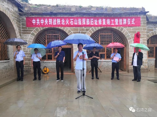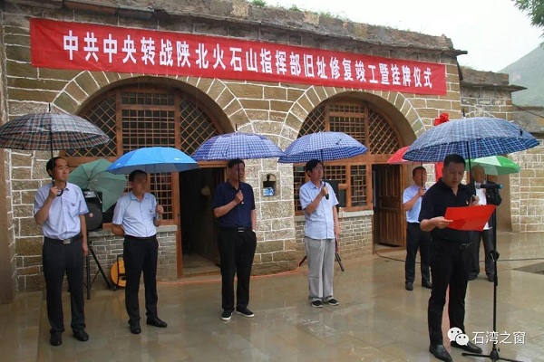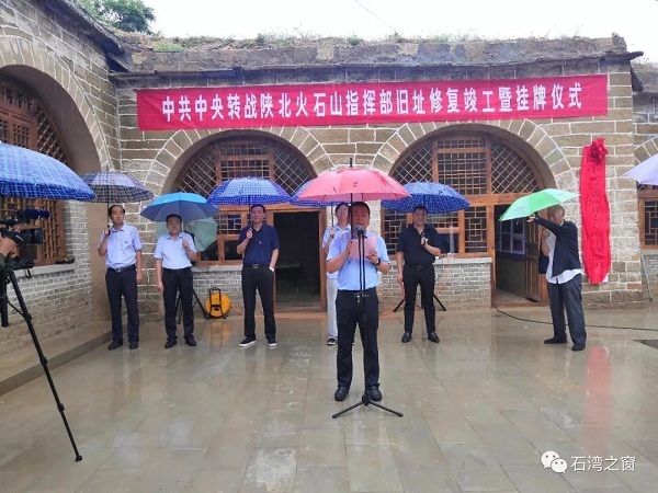 2019年8月3日,石灣鎮(zhèn)舉行中共中央轉(zhuǎn)戰(zhàn)陜北火石山指揮部舊址竣工暨掛牌儀式。區(qū)人大常委會(huì)副主任牛清國同志、區(qū)委組織部副部長崔春斌同志、區(qū)委宣傳部副部長張玉同志、區(qū)文化和旅游文物廣電局局長郝永春同志出席掛牌儀式,參加儀式的還有石灣鎮(zhèn)黨委書記曹波同志、鎮(zhèn)長賀鵬飛同志以及各行政村黨支部書記、村委會(huì)主任、黨員代表近百人。掛牌儀式由石灣鎮(zhèn)黨委書記曹波主持。