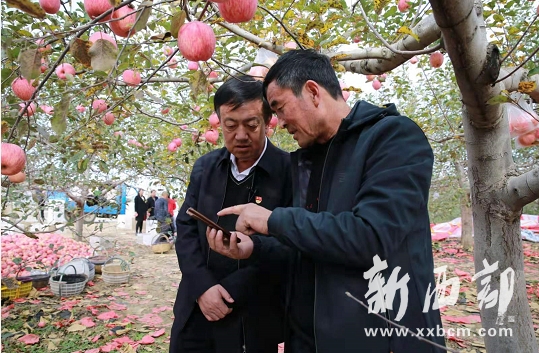 10月31日下午, 云巖鎮(zhèn)辛戶村黨支部書記張延剛給左懷理(左)翻看手機(jī)上蘋果的銷售記錄。