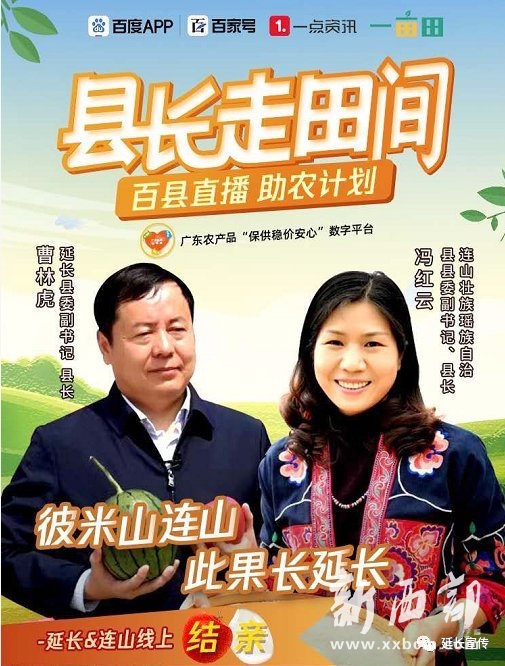 新西部網(wǎng)訊(記者蘇紅義)彼米山連山,此果長延長。4月3日下午16:00,陜西省延長縣縣長曹林虎和廣東省清遠(yuǎn)市連山壯族瑤族自治縣縣長馮紅云做客一畝田平臺,推動兩縣在線上“結(jié)親”,將連山大米和延長蘋果等優(yōu)質(zhì)農(nóng)產(chǎn)品推介給廣大網(wǎng)友。