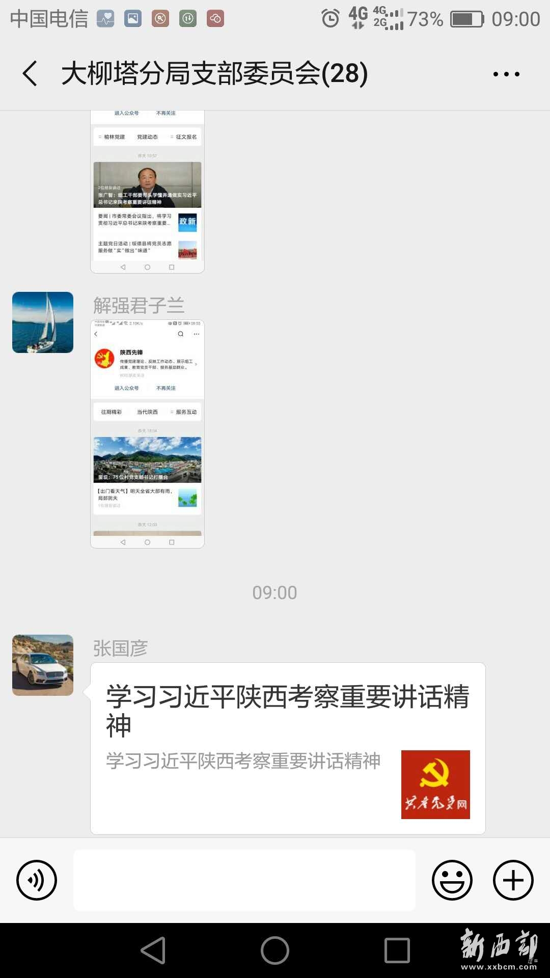 活動中,為了能使同志們以后夠更加及時、精準(zhǔn)的獲取到黨建新聞及相關(guān)知識,分局組織全體黨員們通過微信關(guān)注了陜西先鋒、榆林黨建、神木黨建的公眾號。隨后組織同志們觀看學(xué)習(xí)了習(xí)近平總書記在陜西考察時重要講話精神及省委書記胡和平主持的省委理論學(xué)習(xí)中心組專題學(xué)習(xí)視頻。最后張福廷同志強調(diào):一是要緊抓學(xué)習(xí),采取集中學(xué)習(xí)與自學(xué)結(jié)合的方式,組織黨員干部原原本本學(xué)、全面系統(tǒng)地學(xué)、結(jié)合實際學(xué),準(zhǔn)確的把握習(xí)近平總書記來陜考察重要講話核心要義。二是我們要以習(xí)總書記為榜樣,時刻記得自己的使命,我們要直面黨內(nèi)存在的種種問題和弊端,推動黨風(fēng)、政風(fēng)好轉(zhuǎn),要培養(yǎng)斗爭精神,始終保持共產(chǎn)黨人敢于斗爭的氣節(jié)。