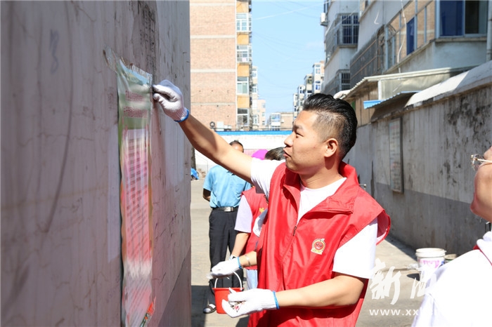 活動(dòng)中,青年志愿者服務(wù)隊(duì)分片包干對(duì)河濱路社區(qū)所轄街道、居民生活區(qū)進(jìn)行環(huán)境衛(wèi)生清理。青年志愿者們重點(diǎn)對(duì)居民樓道、綠化帶內(nèi)丟棄的煙頭、枯葉等垃圾進(jìn)行清理,并對(duì)社區(qū)廣告牌進(jìn)行耐心細(xì)致地擦洗。志愿者們撿拾廢棄物,鏟除野廣告的同時(shí)呼吁大家愛護(hù)環(huán)境。路過(guò)的居民主動(dòng)向志愿者們遞上礦泉水,感謝他們的付出。