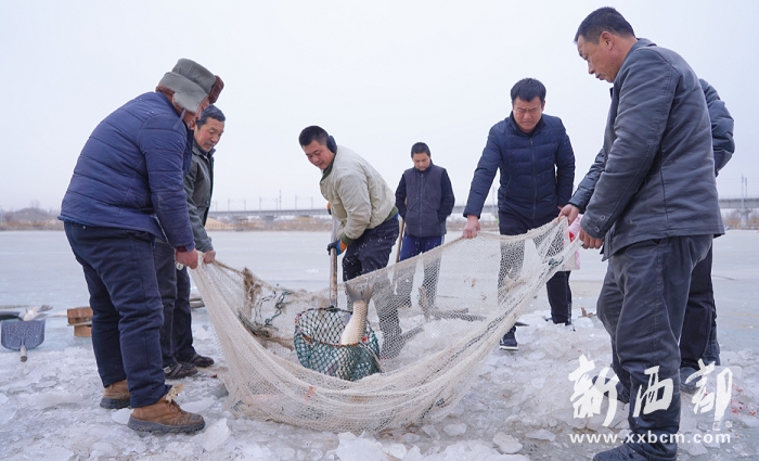 近日,筆者來(lái)到榆陽(yáng)區(qū)孟家灣鄉(xiāng)的三道河則村,數(shù)九寒天,在零下十幾度的室外溫度下,這里的魚(yú)塘已經(jīng)結(jié)起了厚厚的冰面,經(jīng)驗(yàn)豐富的捕魚(yú)人已經(jīng)在這片魚(yú)塘上鑿了眾多的冰眼,準(zhǔn)備下網(wǎng)開(kāi)始一次小型的冬捕。為了供應(yīng)節(jié)日市場(chǎng),這里幾乎天天都要進(jìn)行冬捕,魚(yú)塘里魚(yú)躍人歡,一派豐收景象。