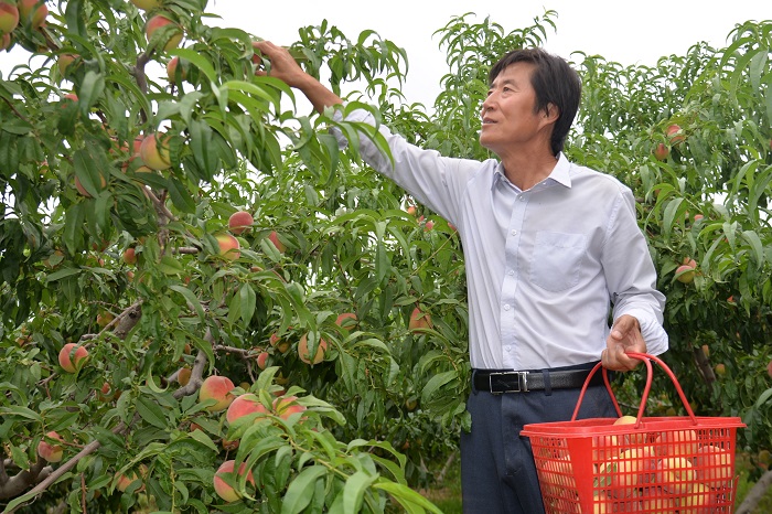 見到王文章時(shí),老王正帶著客商在桃園里看桃子。這幾天,桃子陸續(xù)成熟,老王除了做好桃子采摘前的各項(xiàng)準(zhǔn)備,還要招呼陸續(xù)前來的客商,期間,還不時(shí)有老客戶打來電話,詢價(jià)議價(jià)下訂單。